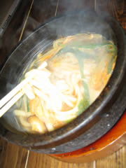 そうこうしている内に締めに頼んだ「やきや特製辛みうどん」が来たようです。何かいっぱい持ってきてるぞ。何だろう?お姉さんが「お待たせしました」と言いながら、テーブル上で熱々に焼いた石焼き鍋に、麺と具を入れてその上からスープを注ぎます。するとワッと美味しそうな香りが匂い立つと同時に、ジューという音と煙がいっぱい。鍋の中はグツグツと沸騰してて、今にも溢れ出そうになっています。これは何とも旨そうだ。うどんを作ってくれている間は約3分間。お姉さんはいろいろ気さくに話しかけてくれてちょっとお友達気分です。